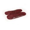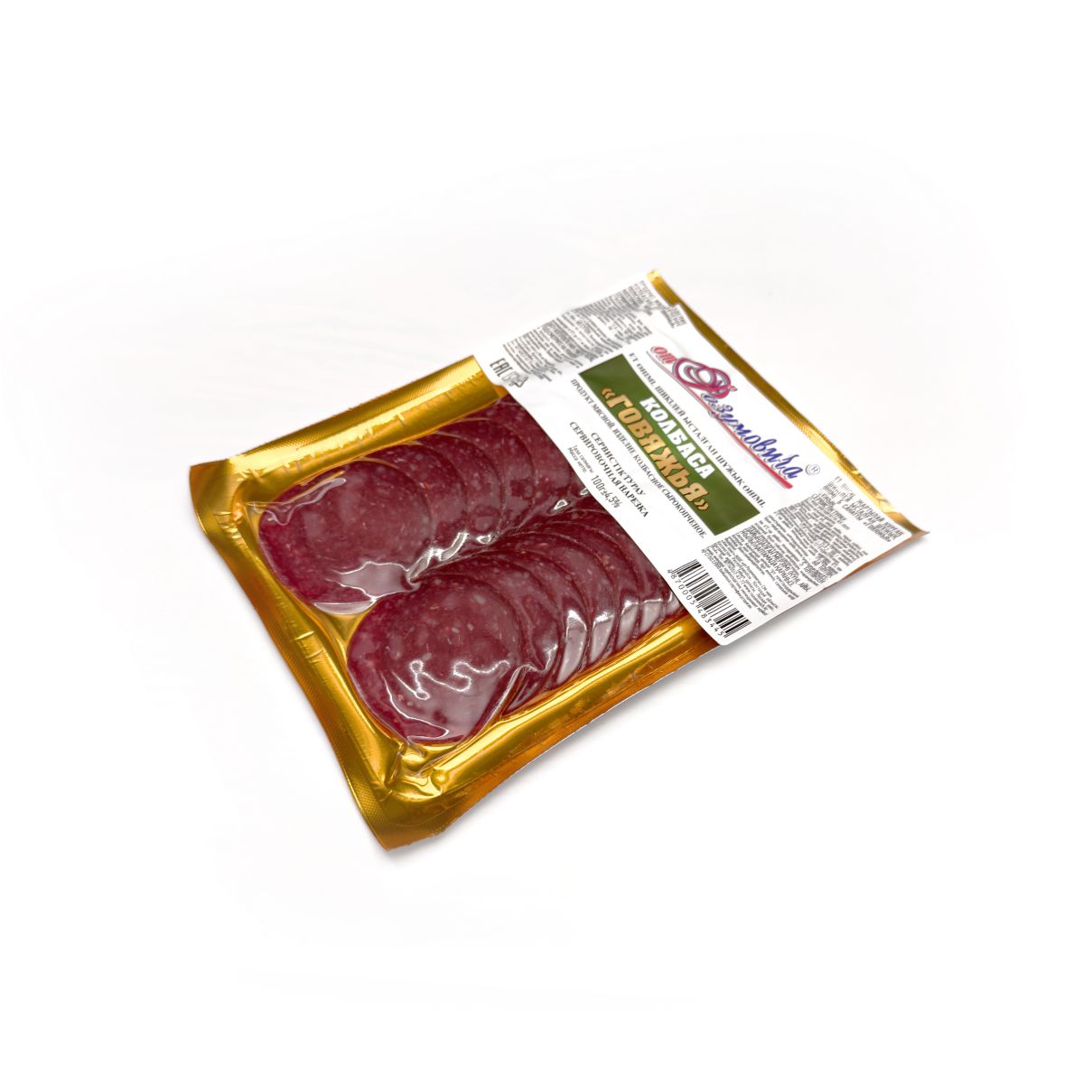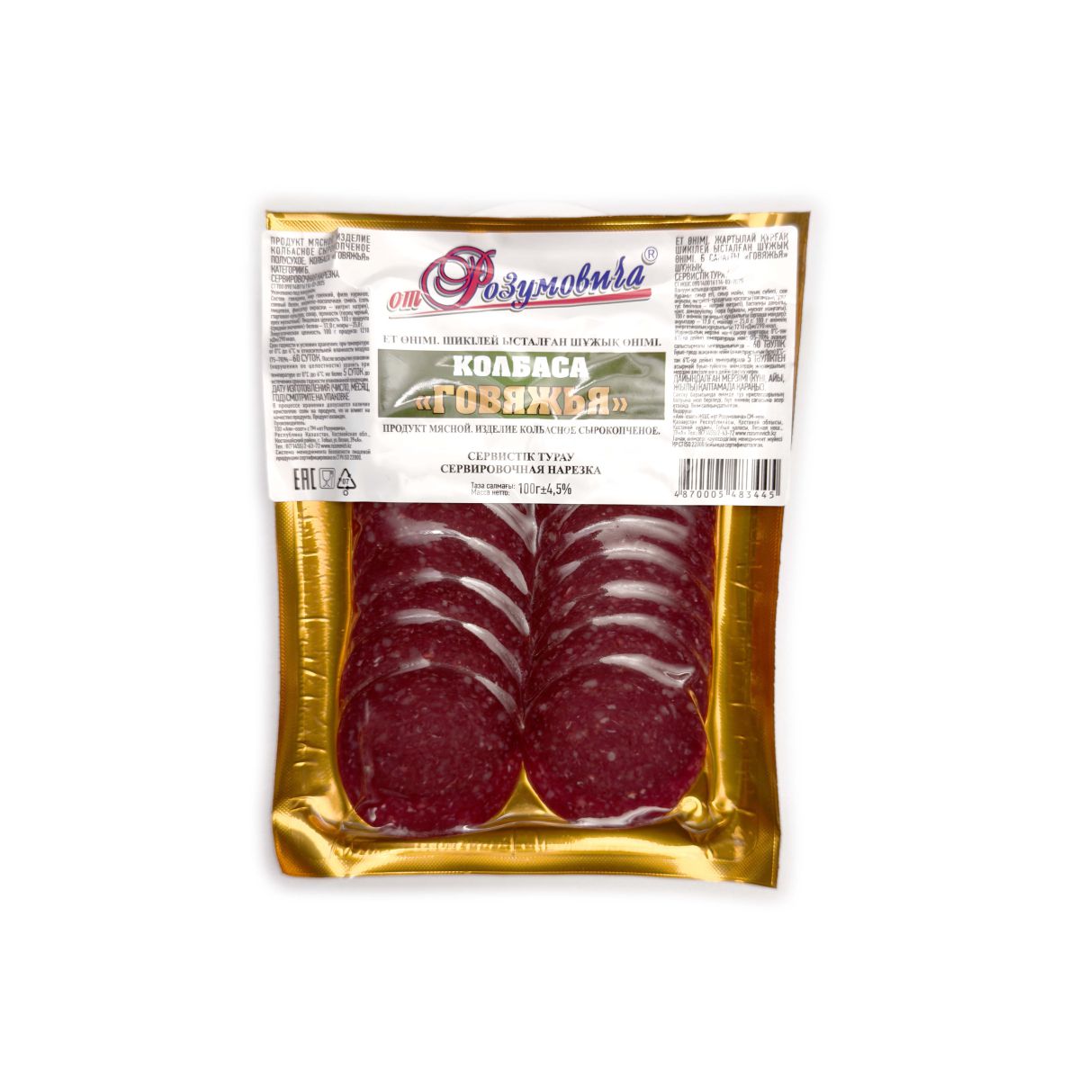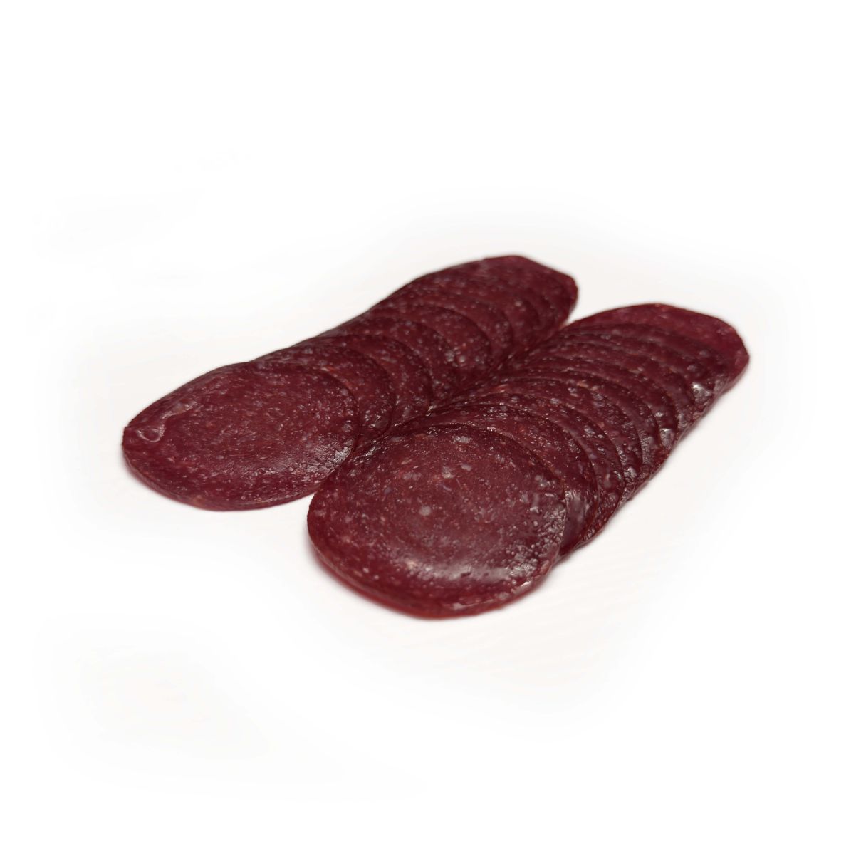 Состав: говядина, жир говяжий, филе куриное, соевый белок, нитритно-посолочная смесь (соль пищевая, фиксатор окраски – нитрит натрия), стартовая культура, сахар, пряности (перец черный, орех мускатный).