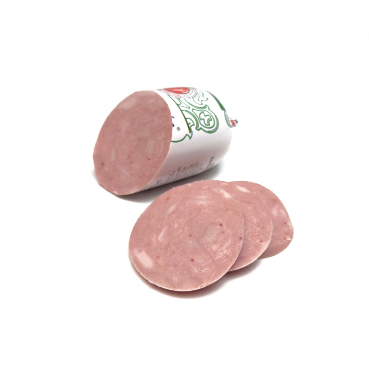 Состав: мясо кур, говядина, вода питьевая, крахмал картофельный, соль поваренная пищевая, специи и экстракты специй, стабилизатор Е450,фиксатор окраски–нитритно-посолочная смесь, загуситель Е407а, усилитель вкуса и аромата Е621, антиокислитель Е316, краситель Е124.