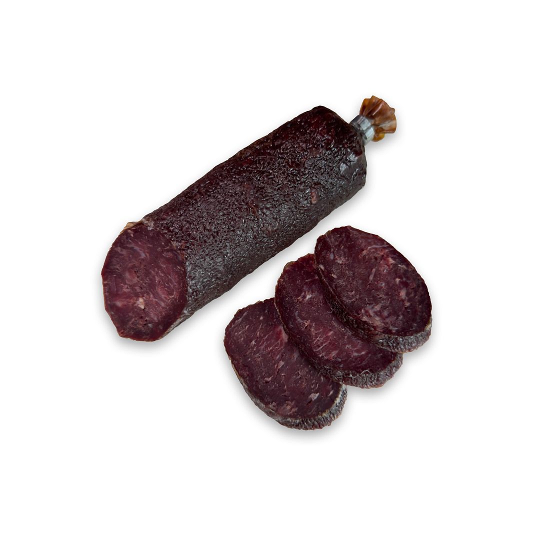 Состав: говядина, конина, курица, нитритно-посолочная смесь (соль пищевая, фиксатор окраски – нитрит натрия), сахар, пряности (чеснок, перец черный, орех мускатный), стартовая культура.