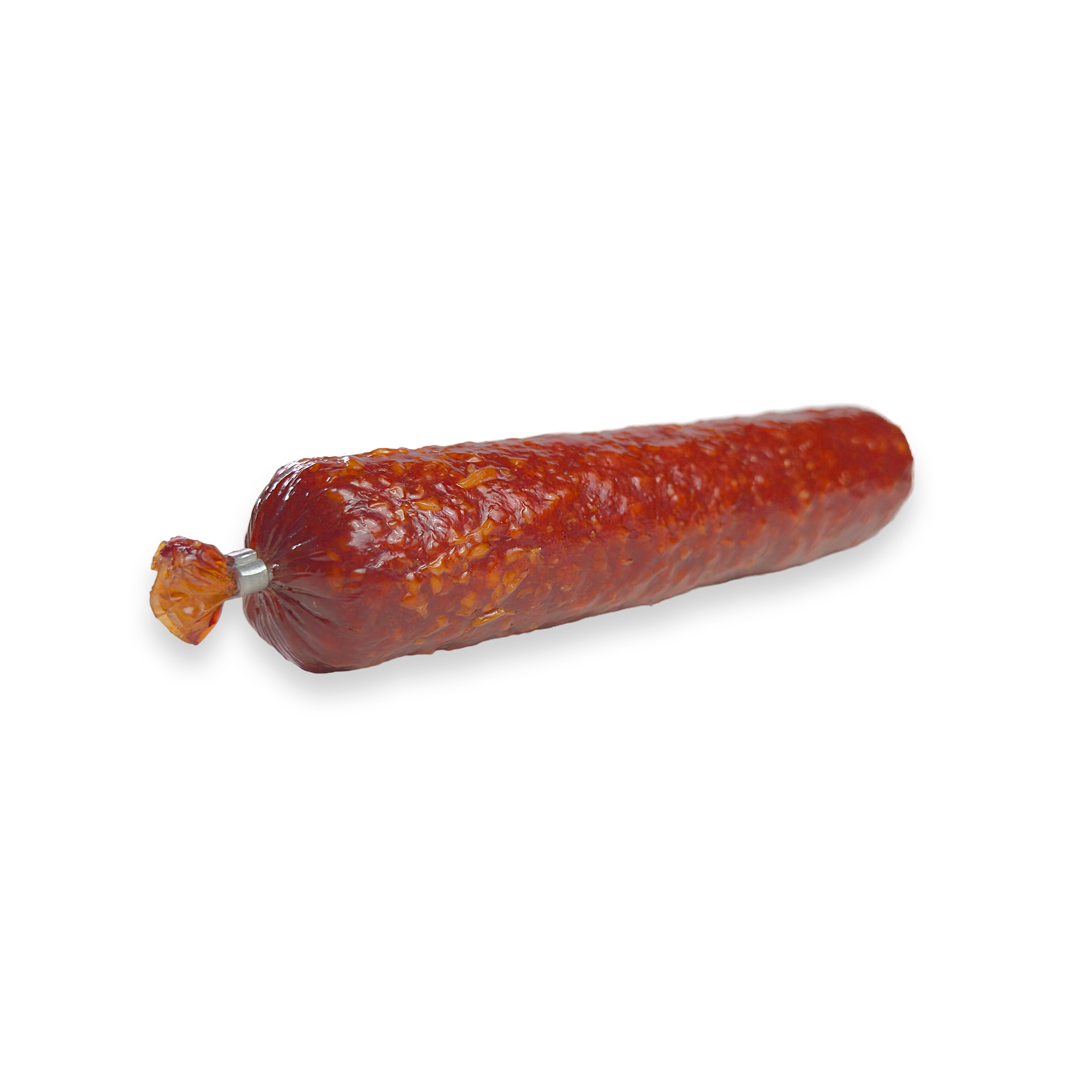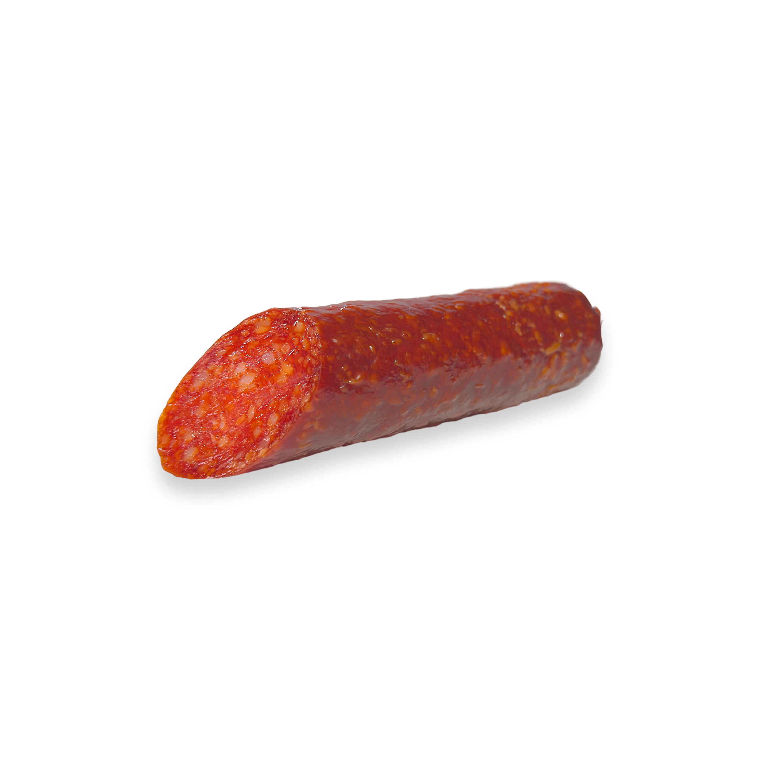 Состав: свинина, филе куриное, шпик, соевый белок, нитритно-посолочная смесь (соль пищевая, фиксатор окраски – нитрит натрия), стартовая культура, сахар, пряности (перец чили, паприка, перец черный)