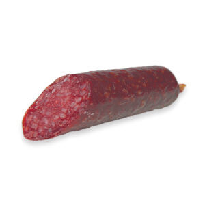 Сырокопченая колбаса имеет плотную, но нежную текстуру и характерный темно-красный цвет. Это идеальный продукт для любителей насыщенных мясных вкусов и ароматов.