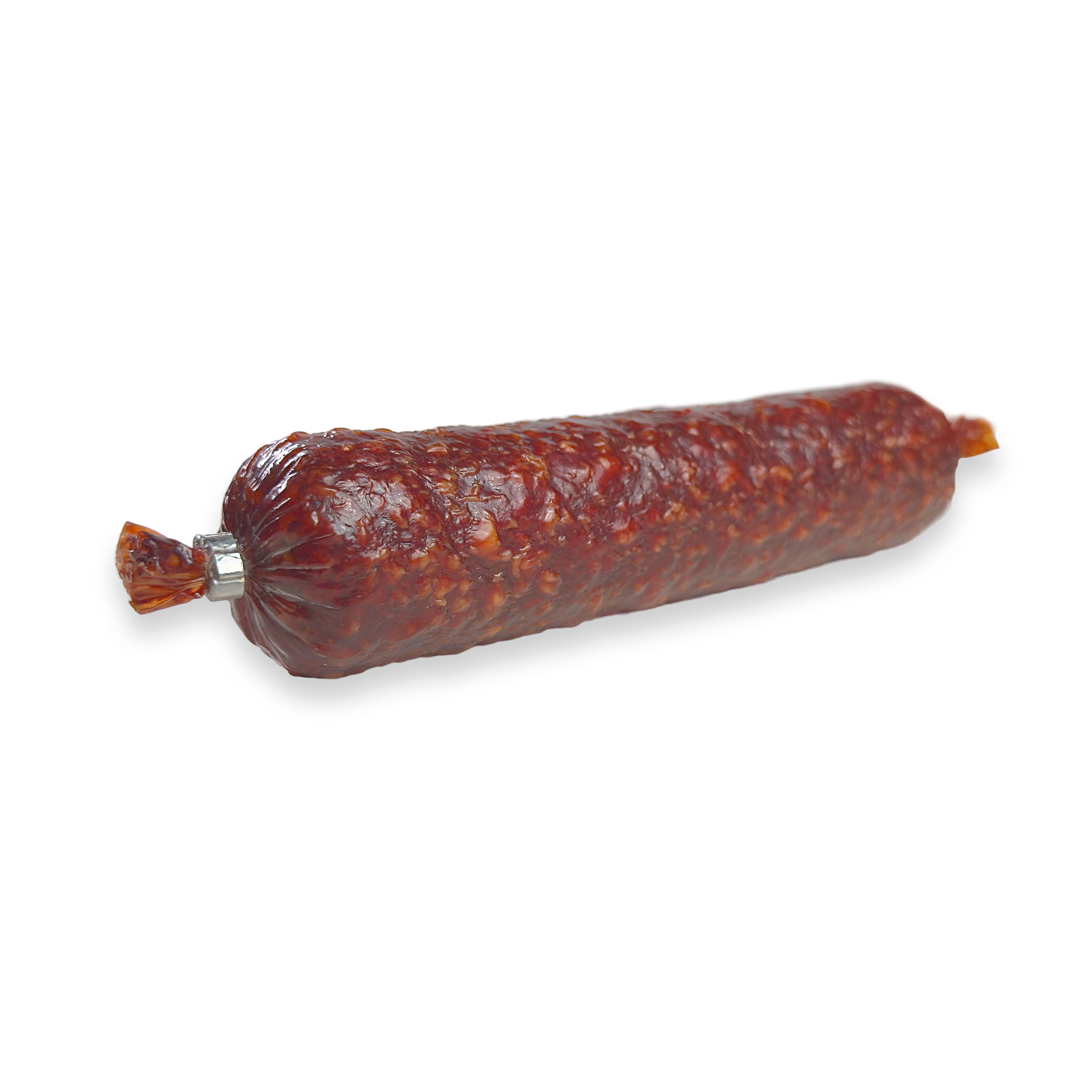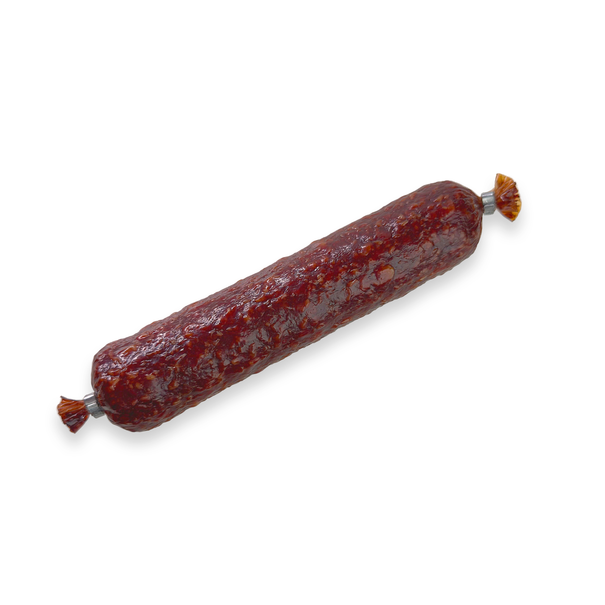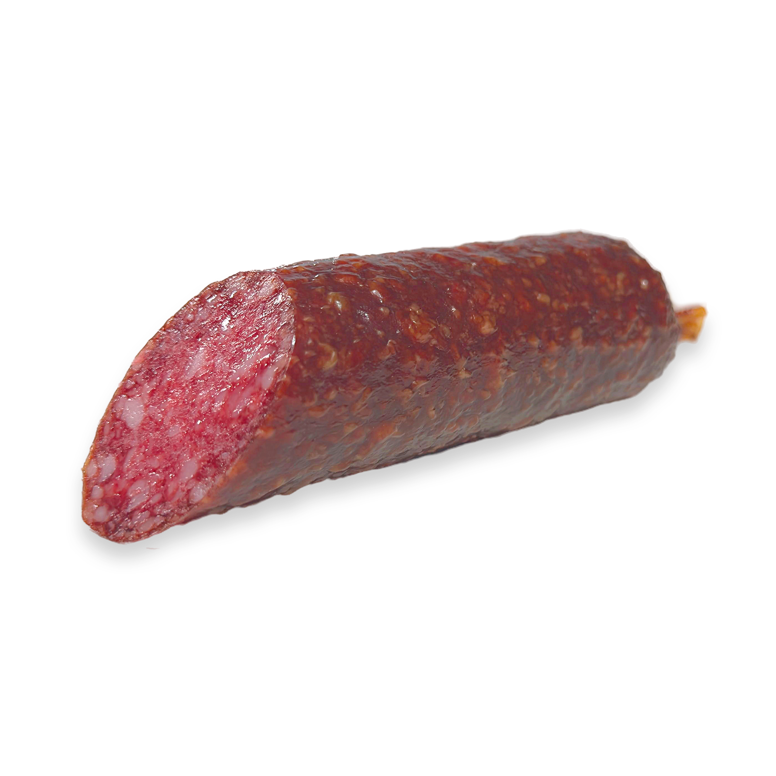 Сырокопченая колбаса имеет плотную, но нежную текстуру и характерный темно-красный цвет. Это идеальный продукт для любителей насыщенных мясных вкусов и ароматов.
