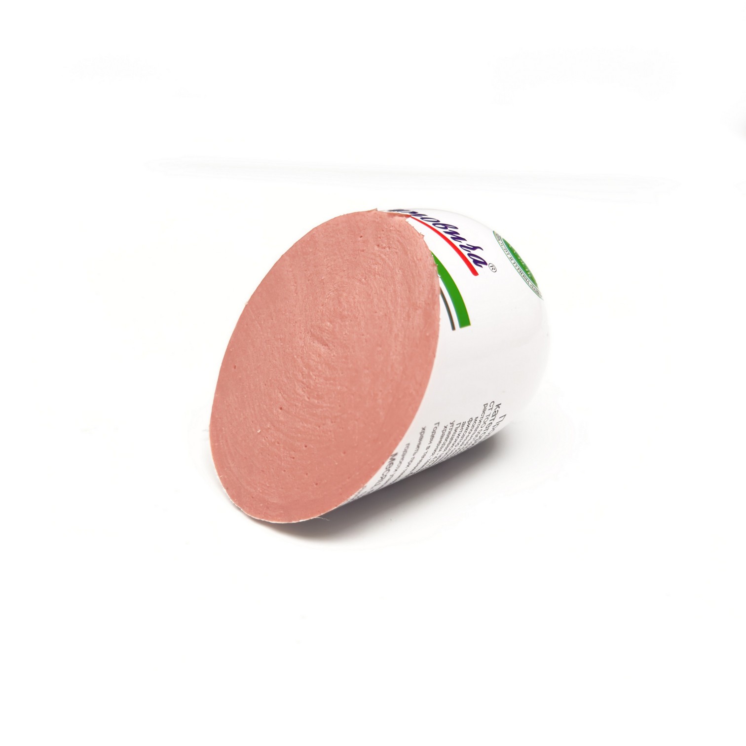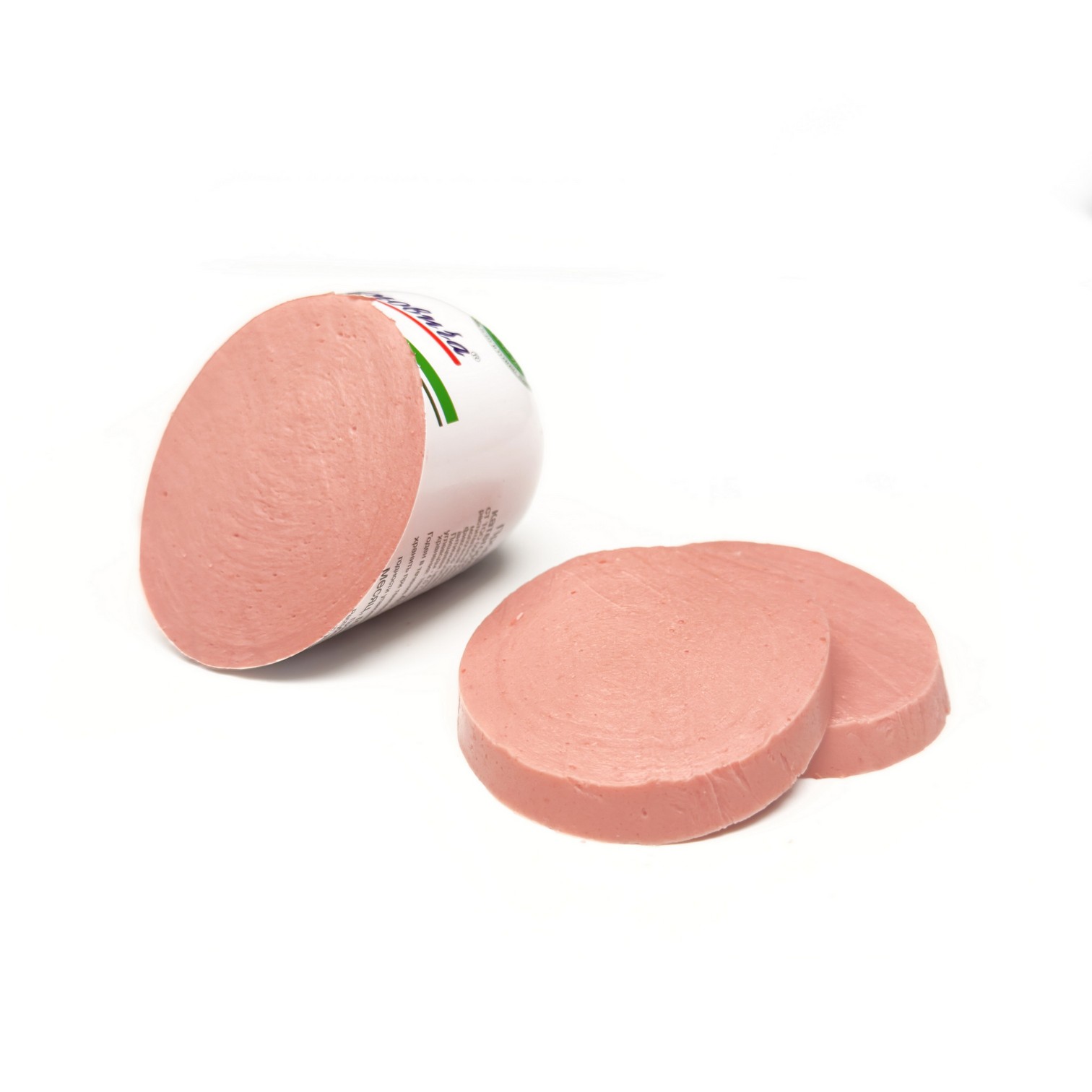 Состав: говядина, филе куриной грудки, вода питьевая, белковый стабилизатор, растительный белок, соль поваренная пищевая, яйцо куриное, молочный белок, специи и экстракты специй, сахар, стабилизатор Е450, фиксатор окраски – нитритно-посолочная смесь, усилитель вкуса и аромата Е621, антиокислитель Е300, краситель Е120.