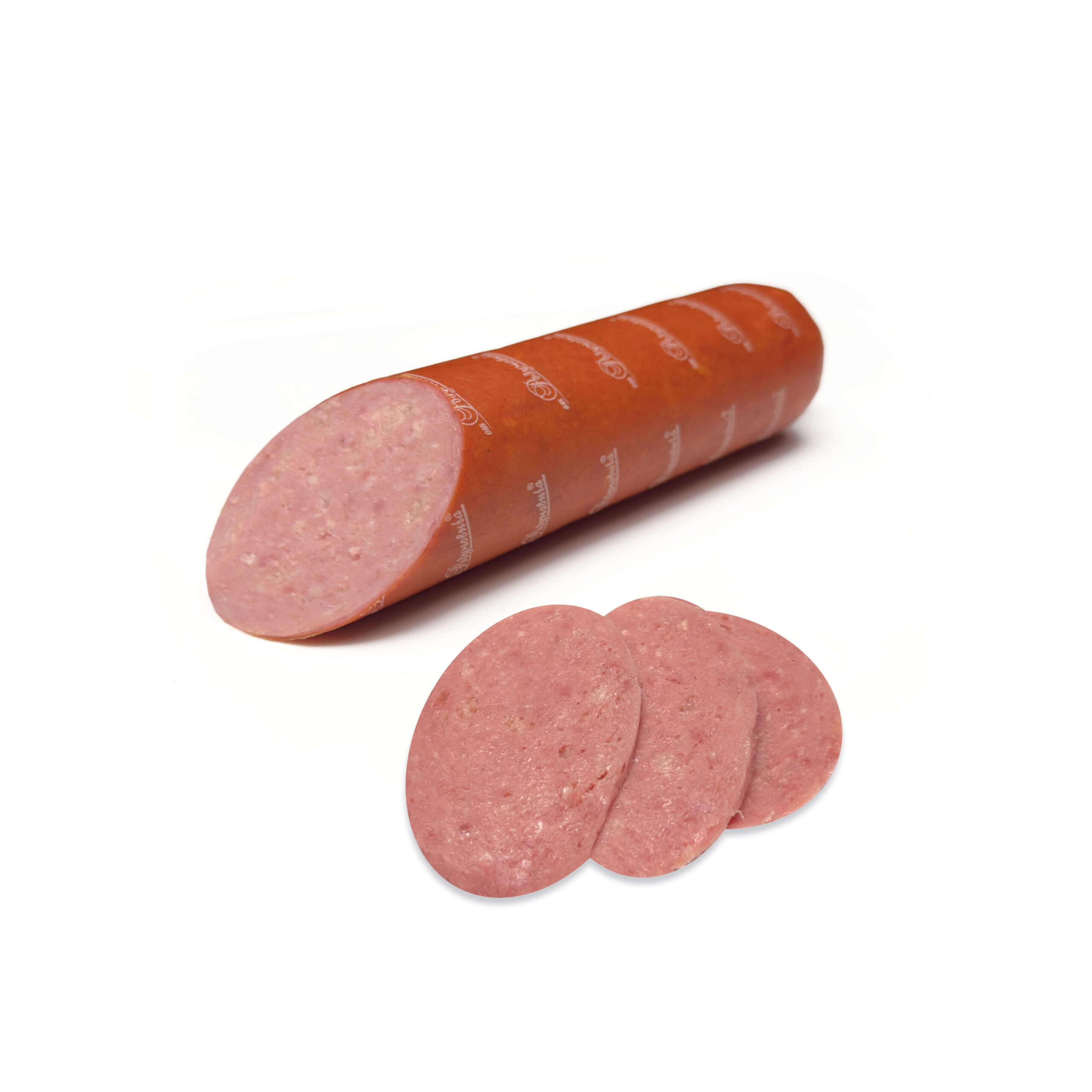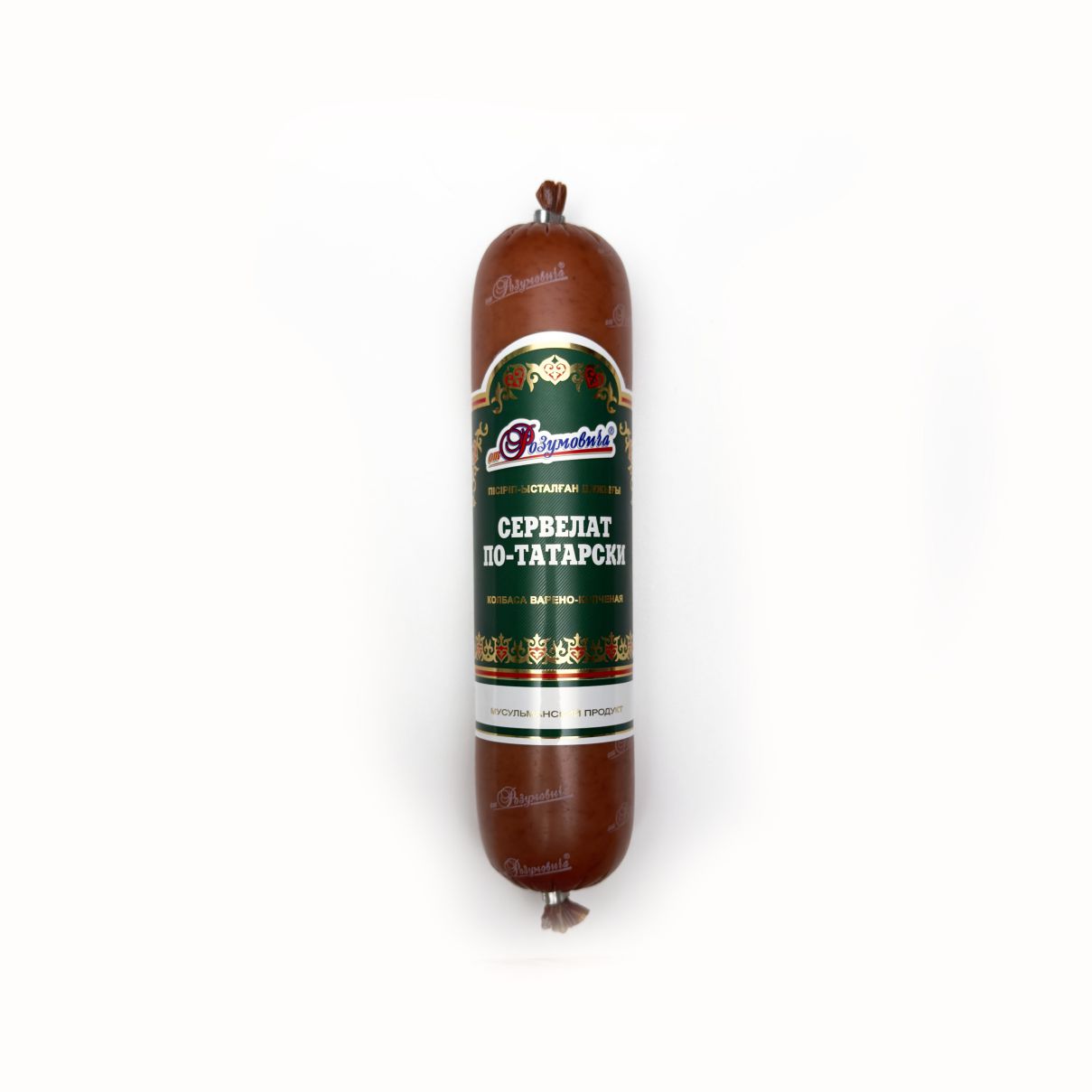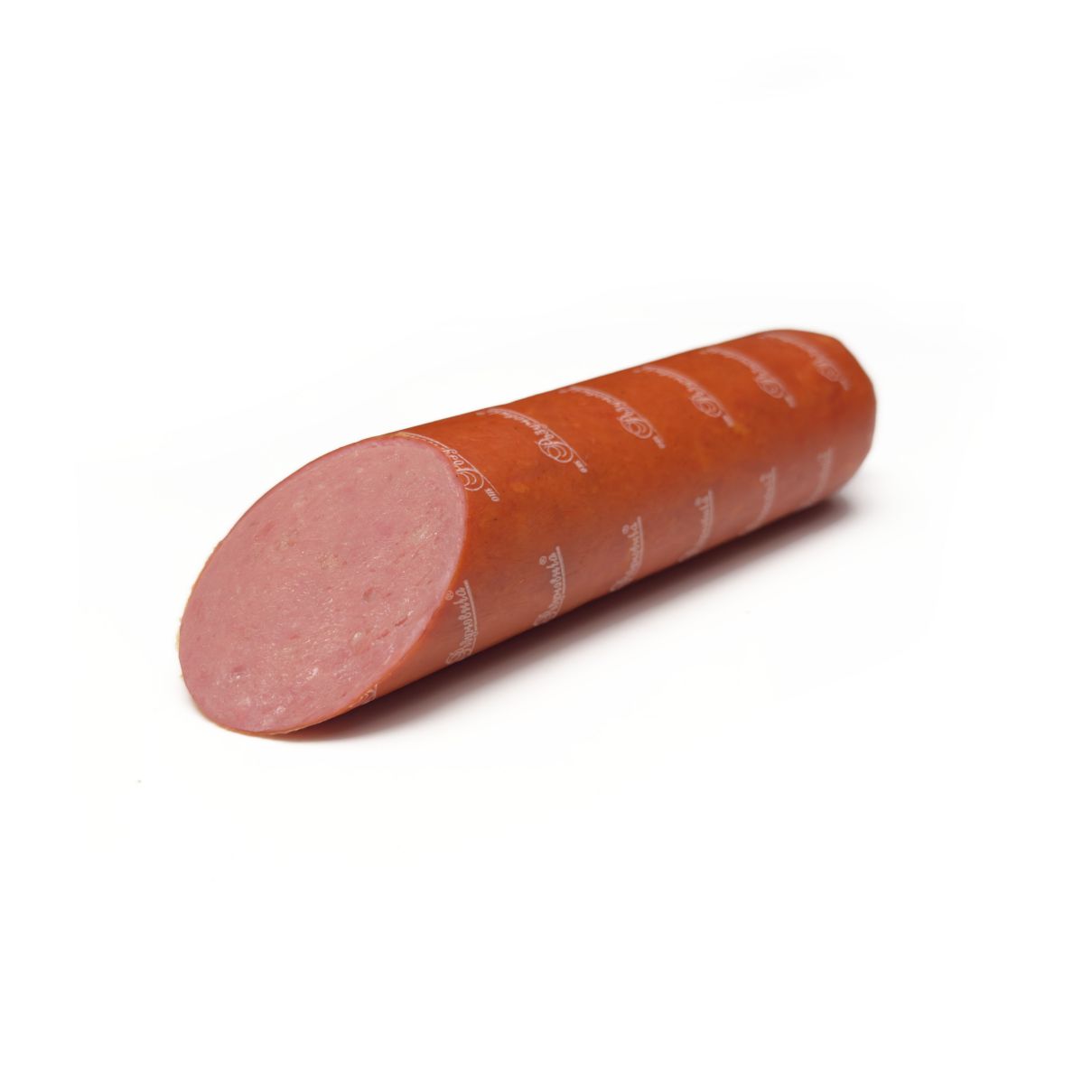 Состав: говядина, молоко сухое, вода питьевая, крахмал картофельный, соль поваренная пищевая, специи и экстракты специй, стабилизатор Е450, фиксатор окраски–нитритно-посолочная смесь, усилитель вкуса и аромата Е621, антиокислитель Е300, краситель Е120.